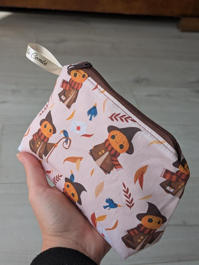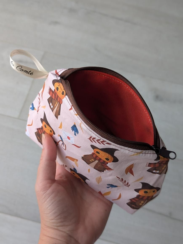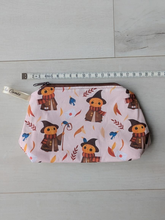 Elle mesure environ 12cmx20cm, possède une doublure, et ferme grâce à son zip.